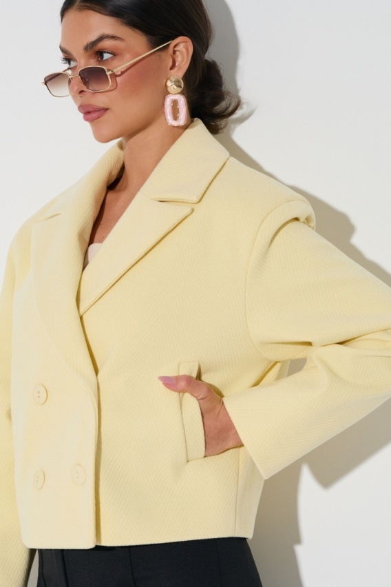 Krótka kurtka o fasonie pudełkowym, wykonana z tkaniny o wyraźnym, strukturalnym splocie w jodełkę. Model charakteryzuje się nowoczesną, skróconą formą typu crop, sięgającą linii bioder. Góra wykończona klasycznym kołnierzem z szerokimi klapami otwartymi. Zapięcie dwurzędowe na guziki z przodu. Obniżona linia ramion oraz proste rękawy bez mankietów nadają całości swobodnego, miejskiego charakteru. Po bokach umieszczono pionowe, wpuszczane kieszenie z szerokim lamowaniem. Tył z centralnym pionowym przeszyciem modelującym sylwetkę. Projekt stanowi hybrydę między klasyczną marynarką a krótkim płaszczem przejściowym.