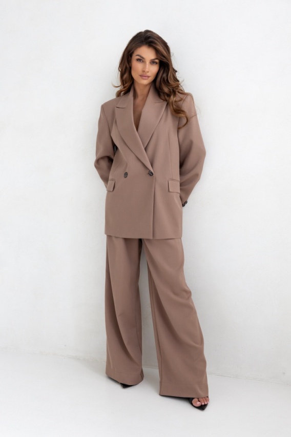 Stylowy, dwuczęściowy garnitur damski. Marynarka z wiązaniem w talii i luźne, szerokie spodnie tworzą elegancki, a zarazem komfortowy look. Idealny wybór na spotkania biznesowe, wyjątkowe okazje lub modny strój codzienny.