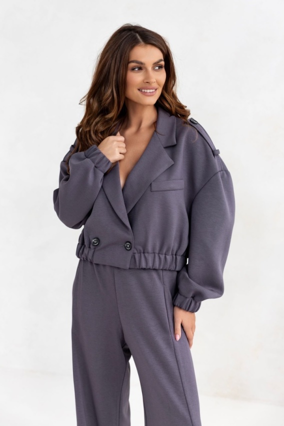 Stylowy komplet damski, składający się z krótkiej marynarki z elastycznym wykończeniem w talii i spodni z szeroką nogawką wiązaną u dołu. Elegancki, a jednocześnie wygodny – idealny na co dzień i specjalne okazje.