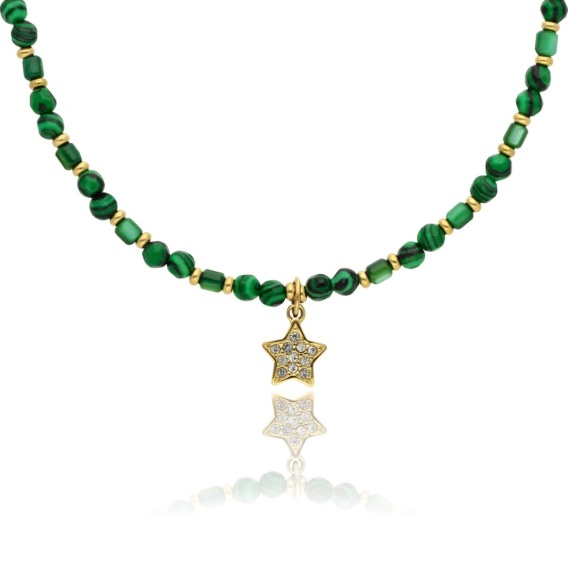Zjawiskowy naszyjnik wykonany z pozłacanej stali szlachetnej, imitacji malachitu i muszli. Połączenie elegancji z subtelną energią kamieni sprawia, że naszyjnik idealnie dopełnia zarówno codzienne, jak i wieczorowe stylizacje. Długość 40 cm + 5 cm regulacji umożliwia dopasowanie do różnych dekoltów. Biżuteria pakowana jest w eleganckie, ekskluzywne pudełko, dzięki czemu doskonale sprawdzi się również jako prezent. Do kompletu dostępna jest także bransoletka o tym samym indeksie, co pozwala stworzyć spójny, stylowy zestaw.